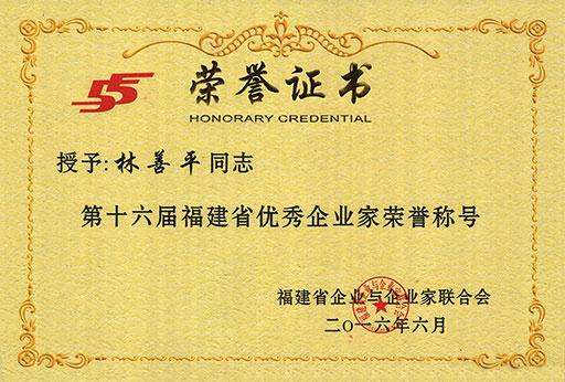 為弘揚優秀企業家深化改革、科學管理、與時俱進、勇于創新的開拓精神,激勵廣大企業家敢為天下先、愛拼才會贏的闖勁,為推動福建省產業轉型升級和經濟持續健康發展建功立業,近日,福建省企業與企業家聯合會組織開展了每兩年評選一次的福建省優秀企業家評選工作,并于2016年6月24日決定授予98位企業經營管理者“第十六屆福建省優秀企業家”榮譽稱號,虹潤公司董事長林善平榮獲該榮譽稱號。