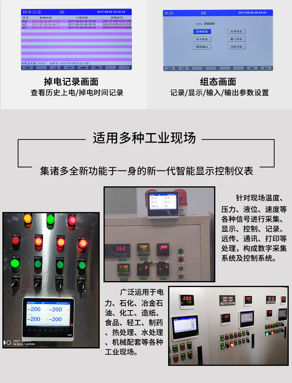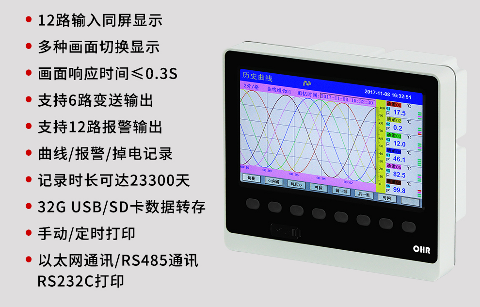 • 彩色無紙記錄儀/溫度記錄儀采用新型大規模集成電路,對輸入、輸出、電源、信號采取可靠保護和強抗干擾設計。機身短節約空間,深度僅為76mm。12路萬能信號輸入,可帶12路報警輸出,6個變送輸出,RS485通訊接口,以太網接口,微型打印機接口和USB接口,SD卡插座。