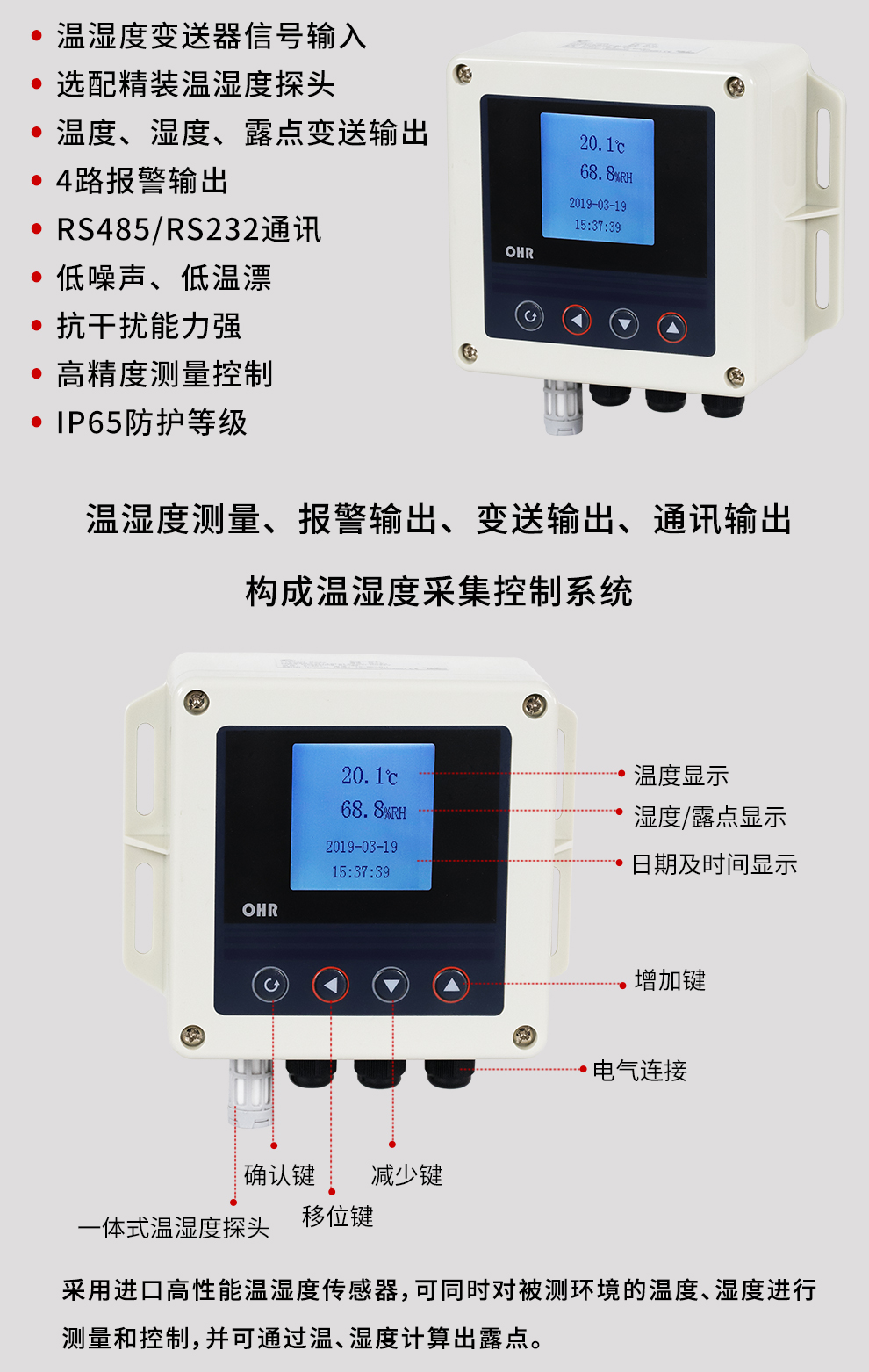 • 溫濕度控制器以先進的32位ARM處理器為核心,采用進口高性能溫濕度傳感器,可同時對被測環境的溫度、濕度進行測量和控制,并可通過溫、濕度計算出露點。它具有精度高、穩定性強、響應速度快等特點,適用于通訊機房、辦公室、醫院、檔案館、博物館、賓館、樓宇自控等場所的溫濕度測量。
