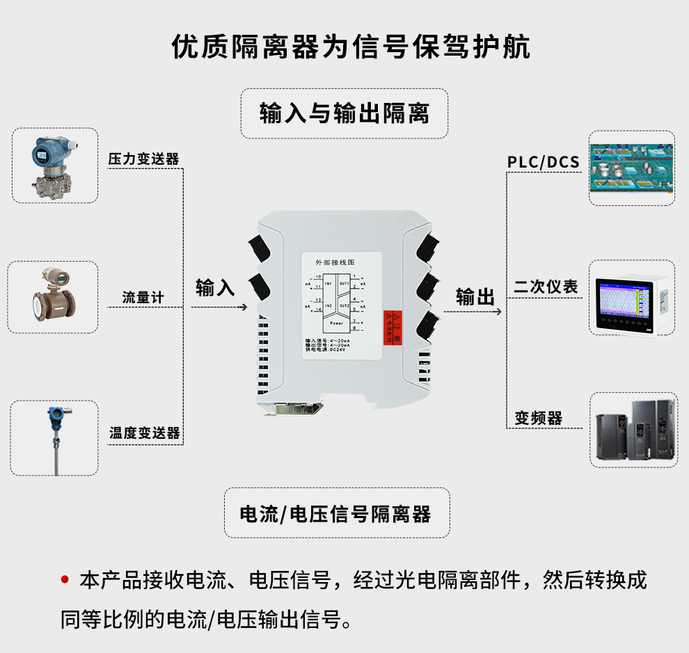 OHR-M31系列智能隔離器將直流電壓或電流信號經(jīng)過隔離傳送,轉(zhuǎn)換成所需的信號給其它儀表。可以與單元組合儀表及DCS、PLC等系統(tǒng)配套使用,給予現(xiàn)場儀表信號隔離、信號轉(zhuǎn)換、信號分配、信號處理等,從而提高工業(yè)生產(chǎn)過程自動控制系統(tǒng)的抗干擾能力,保證系統(tǒng)的穩(wěn)定性和可靠性。