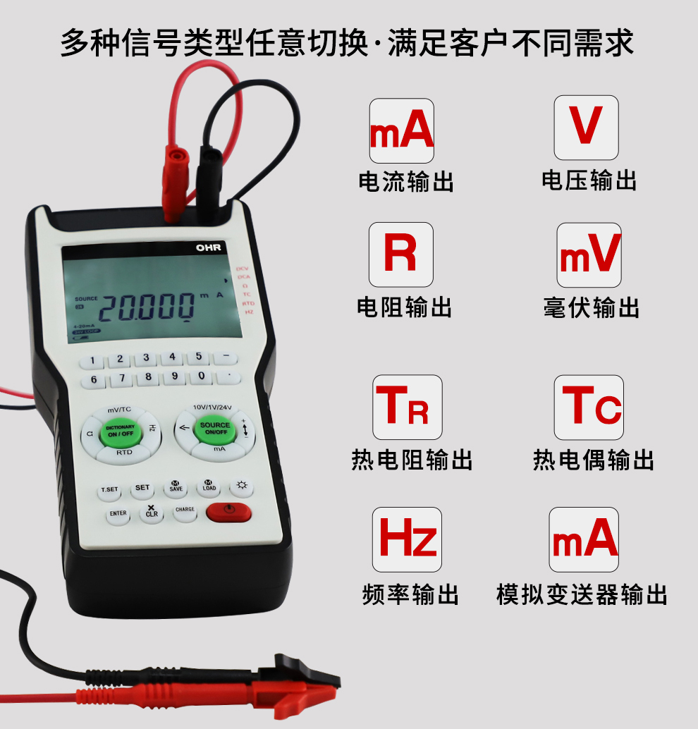 • 信號發生器是一種多功能、高精度便攜式信號源,可用于輸出各種規格的工業信號,支持電流、電壓、電阻、頻率、熱電偶、熱電阻等多種信號輸出類型,最高精度可達0.01%F.S,是工業現場、實驗室以及各類儀表制造商必備的計量測試工具。