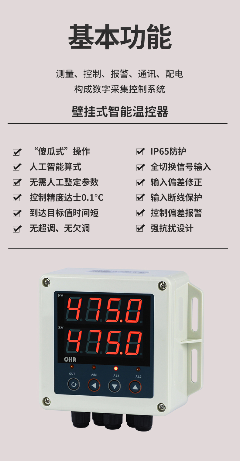 OHR-DN30/DN40系列導軌式智能溫控器/60段程序溫控器采用了表面貼裝工藝,全自動貼片機生產,具有很強的抗干擾能力。本儀表采用人工智能算式,儀表啟動自整定功能,可以根據被控對象的特性,自動尋找參數以達到很好的控制效果,無需人工整定參數,控溫精度基本達±0.2℃,無超調、欠調,性價比高。