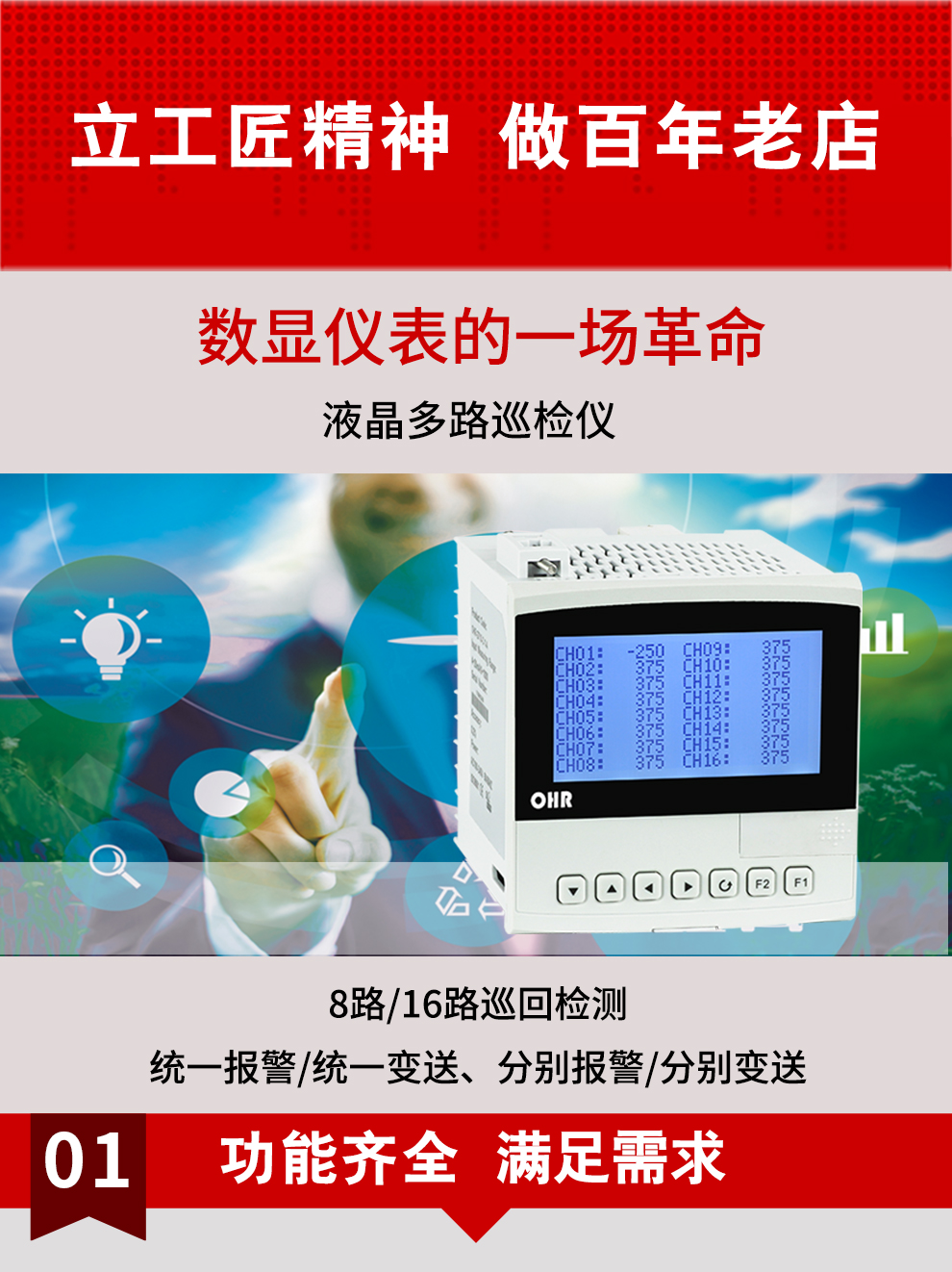 OHR-G700系列液晶多回路測(cè)量顯示控制儀針對(duì)現(xiàn)場(chǎng)溫度、壓力、液位、速度等各種信號(hào)進(jìn)行采集、顯示、控制、遠(yuǎn)傳、通訊、打印等處理。