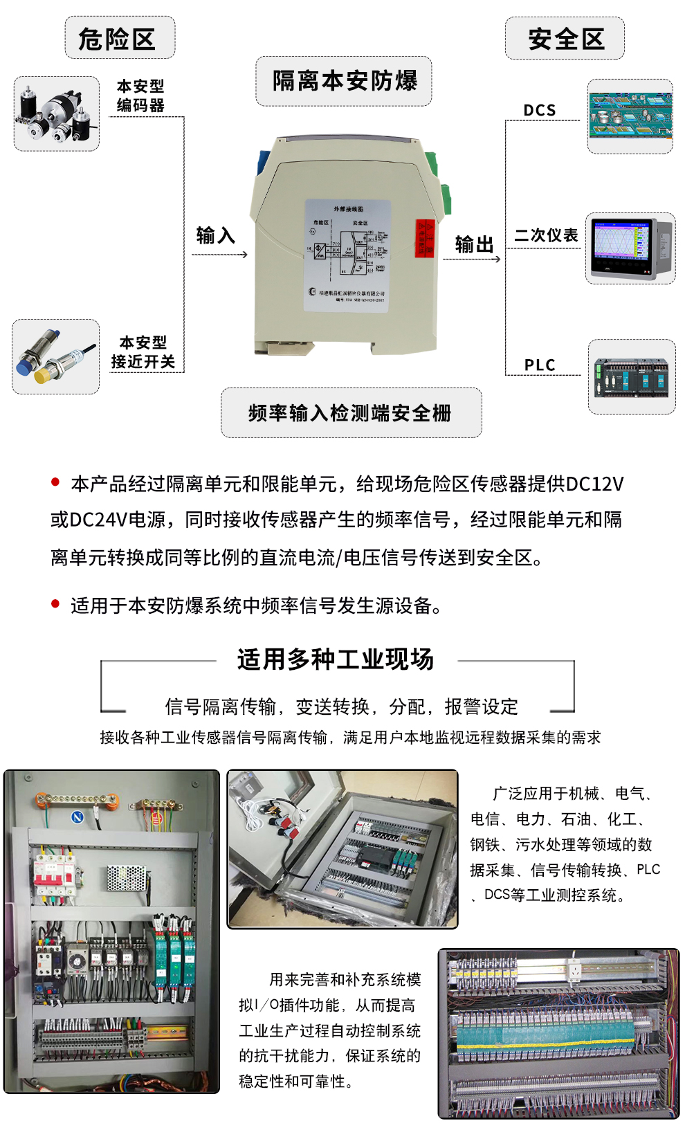 OHR-A34系列頻率輸入檢測端隔離柵可給現場危險區儀表提供12V或24V的隔離電源,危險區儀表產生的頻率信號通過安全柵隔離傳輸到安全側輸出。輸入具有較高的抗干擾性能。該產品需獨立供電,輸入/輸出/電源三隔離。本產品可用在頻率信號源等設備。