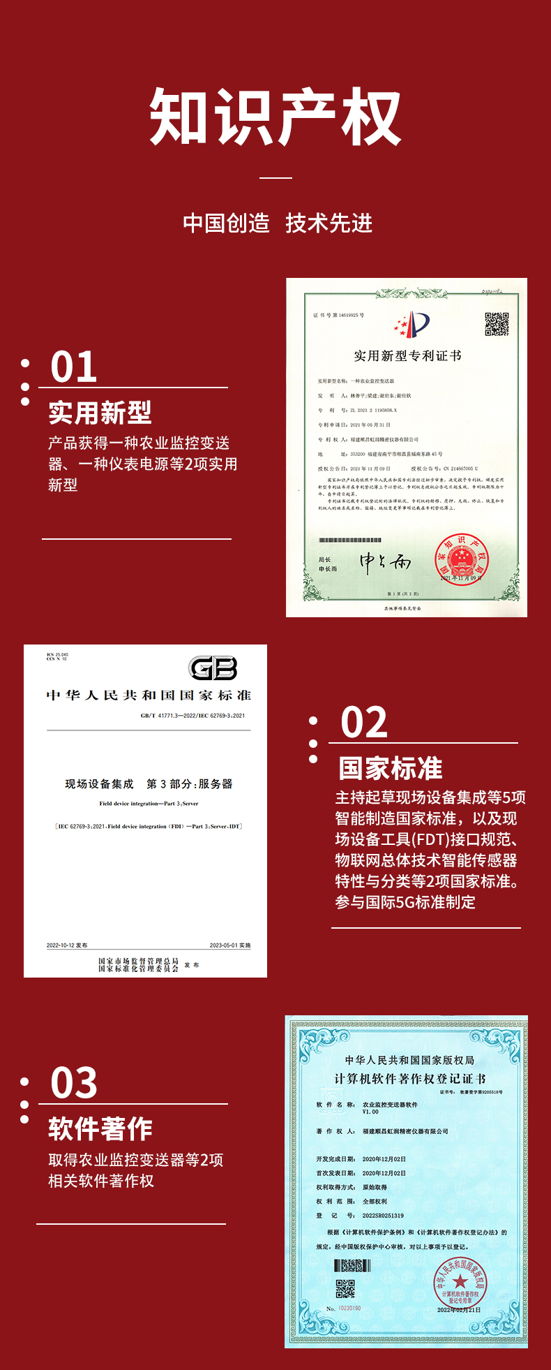 虹潤公司是專業生產環境監測儀表的國家專精特新“小巨人”企業。生產的二氧化碳變送器,具有新型紅外檢定技術,自動溫度補償,響應靈敏,低功耗,模擬量變送輸出或RS485通訊等特點。產品獲得一種農業監控變送器、一種儀表電源等2項實用新型專利,主持起草現場設備工具(FDT)接口規范、物聯網總體技術智能傳感器特性與分類等2項國家標準,參與國際5G標準制定,取得農業監測變送器等3項相關軟件著作權。產品廣泛應用于機房、配電站、地下車庫、工廠倉庫、食品儲存、養殖場、果蔬林園等環境場合對二氧化碳濃度的檢測。